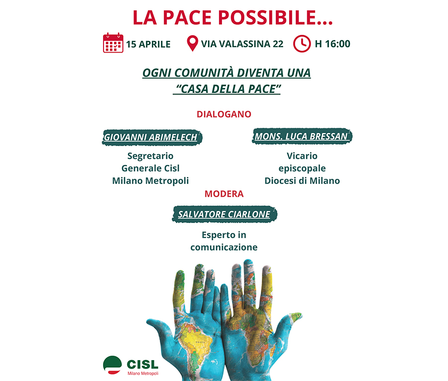 Mercoledì 15 aprile la sala Sandro Antoniazzi della Cisl di Milano, in via Valassina 22, ospiterà l’incontro dal titolo “La pace possibile”. In questi giorni carichi di tensione per le guerre in più parti del mondo, a riflettere sulla necessità della pace interverranno Giovanni Abimelech, segretario generale Cisl Milano, con monsignor Luca Bressan, vicario episcopale della Diocesi di Milano, moderati da Salvatore Ciarlone. L’incontro inizierà alle 16.