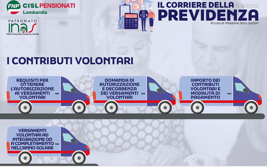 È dedicato ai contributi volontari l’ultimo numero del periodico Il Corriere della previdenza, a cura di Massimo Sarzi Sartori, promosso dai pensionati Cisl della Lombardia e da Inas Cisl. In una guida di 11 pagine, che si possono consultare on line oppure stampare, il pdf dà le prime informazioni utili per chi non lavora più e ha bisogno di versare ancora contributi per poter maturare il diritto alla pensione.