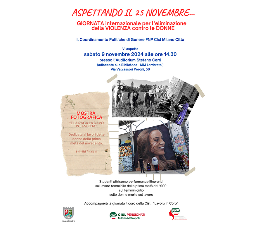 Contro la violenza sulle donne, in vista del 25 novembre, il Coordinamento politiche di genere e Fnp Cisl Milano Metropoli annunciano il primo appuntamento sabato prossimo, il 9, a partire dalle 14.30. All’Auditorium Stefano Cerri di via Valvassori Peroni 56 – in zona Lambrate – sarà allestita la mostra fotografica “E la paga la davo in famiglia”, una rievocazione sul lavoro femminile nella prima metà del Novecento.
