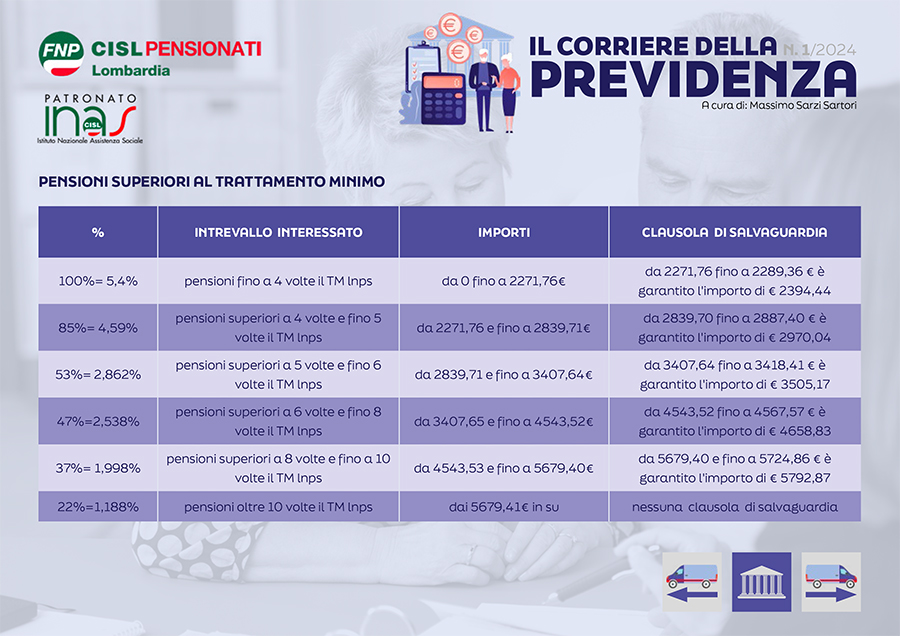 Il Corriere della previdenza di Fnp Cisl Lombardia e Inas pubblica informazioni e tabelle sulle prestazioni previdenziali del 2024. Il periodico, curato da Massimo Sarzi Sartori, in questo primo numero del nuovo anno offre un vademecum mirato per conoscere importi e percentuali in merito all’assegno sociale, all’invalidità sociale, alla quattordicesima e alla perequazione.