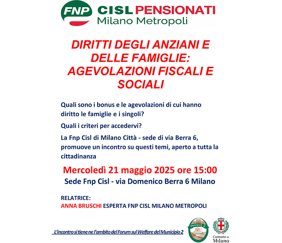 Mercoledì 21 maggio la Fnp Cisl Milano Metropoli, nella sede di via Berra, curerà l’incontro dal titolo “Diritti degli anziani e delle famiglie: agevolazioni fiscali e sociali”. Aperto a tutti, l’appuntamento, previsto nel pomeriggio, tratterà il tema dei bonus, dei contributi economici e delle facilitazioni previste dalla normativa attuale. Anna Bruschi, esperta competente in materia della Fnp Cisl di via Tadino, darà i dettagli in merito a requisiti, categorie e modalità di accesso alle agevolazioni.