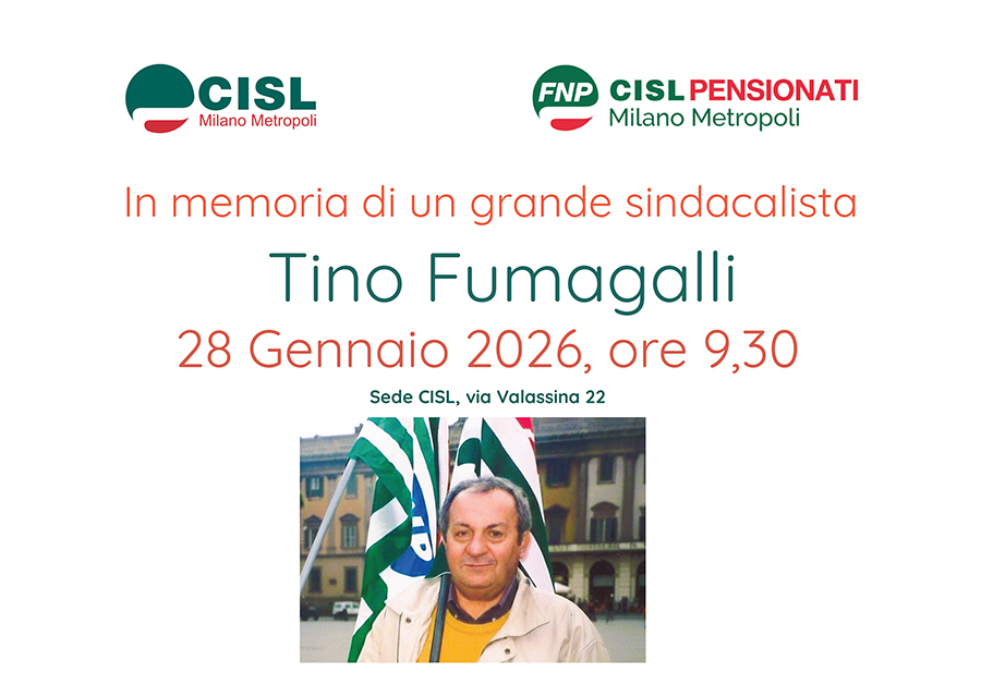 Mercoledì 28 gennaio Cisl e Fnp Milano annunciano un incontro in memoria di Tino Fumagalli. Nella nuova sede Cisl di via Valassina, dalle 9.30, attivisti e pensionati della Cisl, di Milano e dell’hinterland, si ritroveranno per ricordare il sindacalista, scomparso l’estate scorsa. Introdurranno la mattinata i segretari generali della Cisl e della Fnp Giovanni Abimelech e Luigi Maffezzoli.