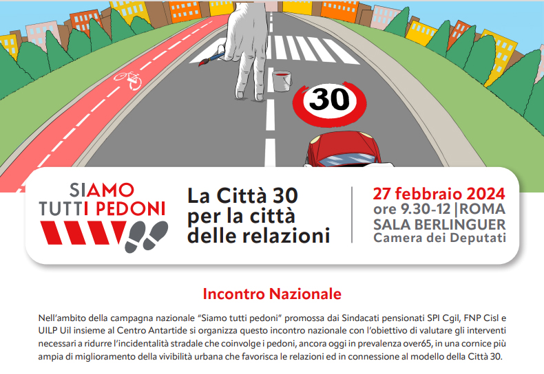 Per l’occasione, il 27 febbraio, dalle 9 alle 12, si terrà un incontro a Roma, alla sala Berlinguer della Camera dei deputati, con rappresentanti istituzionali e dei sindacati dei pensionati. Si parlerà della città 30: un’occasione per ridurre il tasso di incidenti stradali, ma anche per favorire un contesto urbano più aperto alle relazioni.